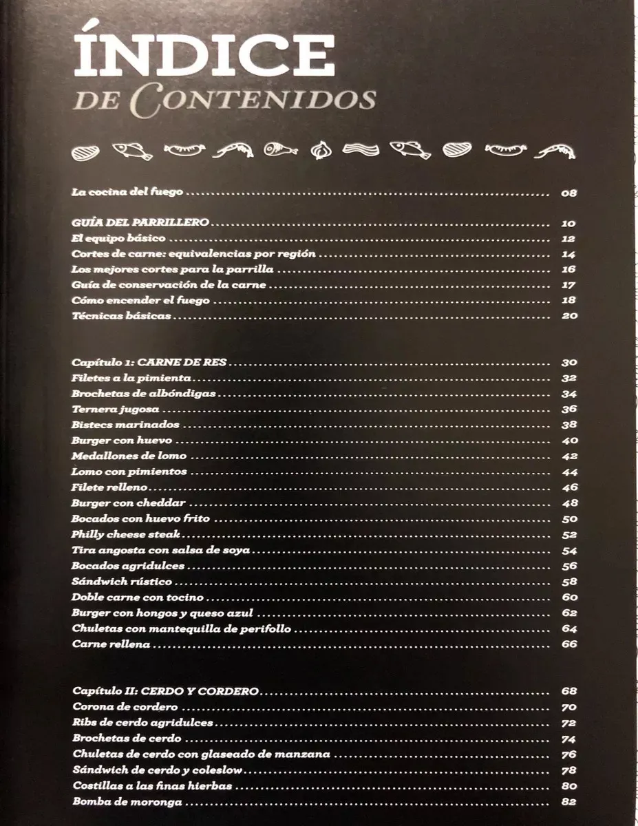 En El Gran Libro de las Parrilladas hallará un completo manual para poder manejar sus parrilladas como el mejor chef. Tanto los utensilios necesarios para cocinar, como las claves para prender el fuego, una guía con los cortes de carne, las técnicas básicas de cocina y hasta de postres originales.